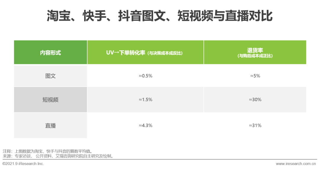 這類變革說明“圖文+短視頻+直播”沉浸式瀏覽已經(jīng)成為必備的線上導(dǎo)購場景。信息獲取與購買決策轉(zhuǎn)移到更個性化與內(nèi)容化的短視頻與直播上。決策路徑上,三類內(nèi)容形式也有較大差異:用戶的購前成本(含訪問成本&決策成本):直播<短視頻<圖文;購后成本:直播>短視頻>圖文。