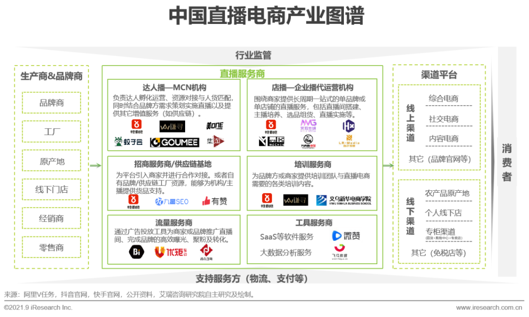 隨著直播電商行業(yè)生態(tài)圈的逐步完善,更多提供細(xì)分服務(wù)和擅長不同品類的服務(wù)商加入到行業(yè)建設(shè)和競爭中。根據(jù)業(yè)務(wù)側(cè)重的不同,服務(wù)商可分為招商服務(wù)商、代運營服務(wù)商、培訓(xùn)服務(wù)商、供應(yīng)鏈服務(wù)商、MCN機構(gòu)、產(chǎn)業(yè)帶服務(wù)商等;根據(jù)場景不同,可以分為檔口直播服務(wù)商、村播服務(wù)商等。目前除了達(dá)人播與店播機構(gòu),其它各類服務(wù)商的界限還是比較模糊的,一方面多數(shù)服務(wù)商提供綜合性解決方案,例如MCN機構(gòu)在平臺拿到牌照可以同時作為招商服務(wù)商與培訓(xùn)服務(wù)商開展業(yè)務(wù),另一方面服務(wù)商未來會有不同的側(cè)重,并且在垂直賽道更有可能出現(xiàn)頭部玩家(由于2020年直播電商報告已經(jīng)較清晰地描述了其它主要參與方,本圖譜主要闡述直播服務(wù)商的類型與代表企業(yè))。
