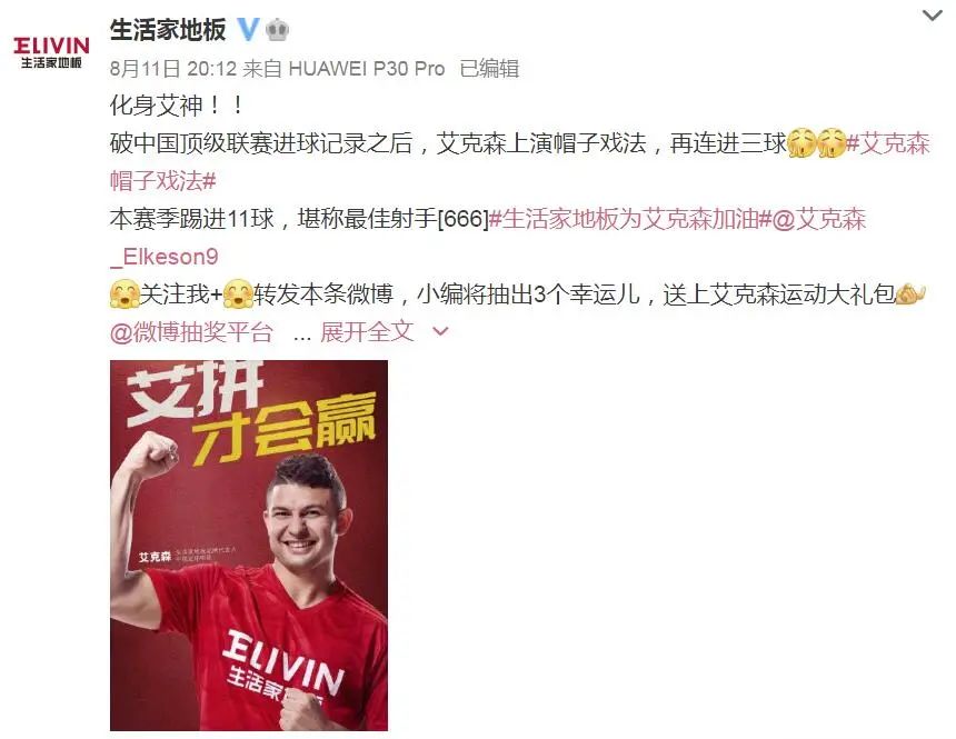 8月11日,艾克森迎來聯賽本賽季第一階段的最后一戰,以11粒進球的出色成績為2021年賽季交上完美答卷。隨之,#艾克森帽子戲法#成為熱門話題,生活家地板也緊跟熱點在官方微博發起抽獎活動,在話題貢獻者排行中,生活家地板位居榜首,生活家無時無刻不在關注和助力艾克森。