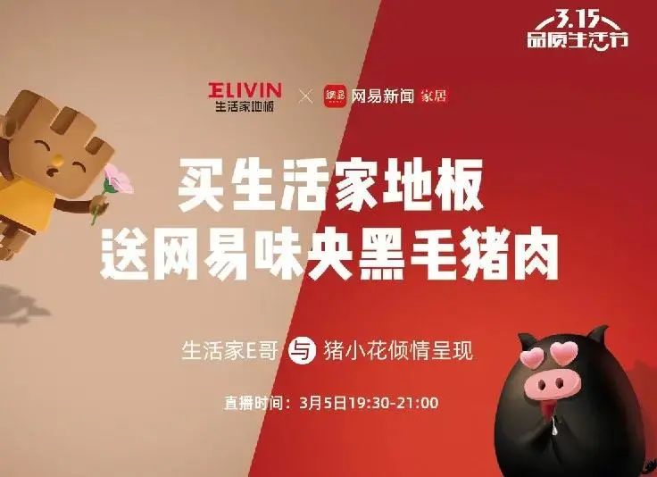 3月,生活家打響開年第一站——品質生活節,生活家地板與網易跨界聯合,買生活家地板送網易未央黑毛豬肉,共同助力給消費者提供好吃好住的家居生活環境。促銷活動也在全國各大城市落地,惠動全國,讓每個家庭都能以心動的價格享受到生活家的優質產品,構建千萬家庭的幸福家居生活。