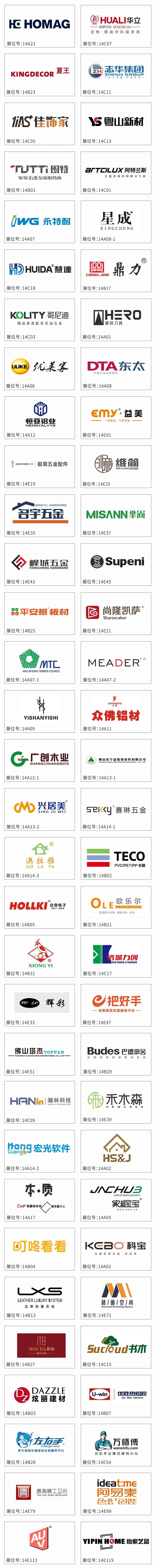 (1)家居照明:阿特蘭斯、合奇、家櫥寶、米德、輝彩智能、禾木森、酷家照明、卷對卷、五一、AUV。(2)膠水/涂料版塊:永特耐、優(yōu)勝、路嘉。(3)全屋定制版塊:慕柏、歐文家居、宣林木業(yè)、成都小代玻璃門、怡家?藝品、華松居。(1)機械設(shè)備:鼎力、豪邁、慧達、共翔。(2)全鋁/鋁材版塊:眾佛、凱豐鋁材、克洛澤、弗龍、惠百、派佳鋁業(yè)、合盾。(3)其他優(yōu)質(zhì)企業(yè):Glancing EYE Co、拓普理德。