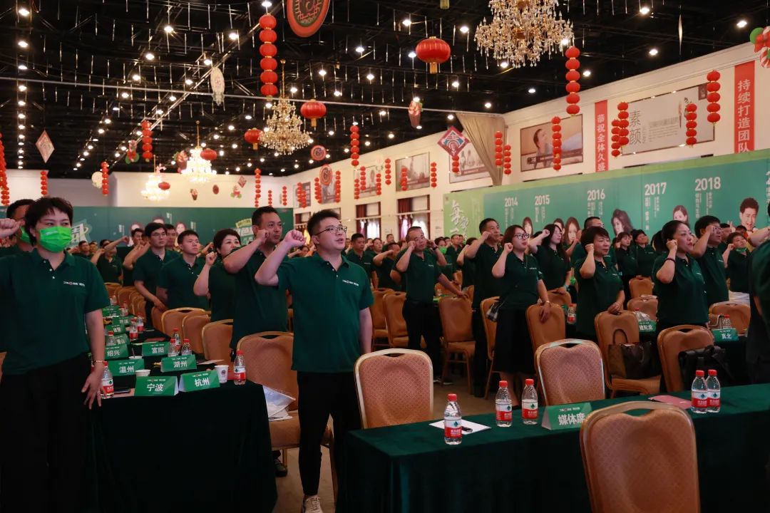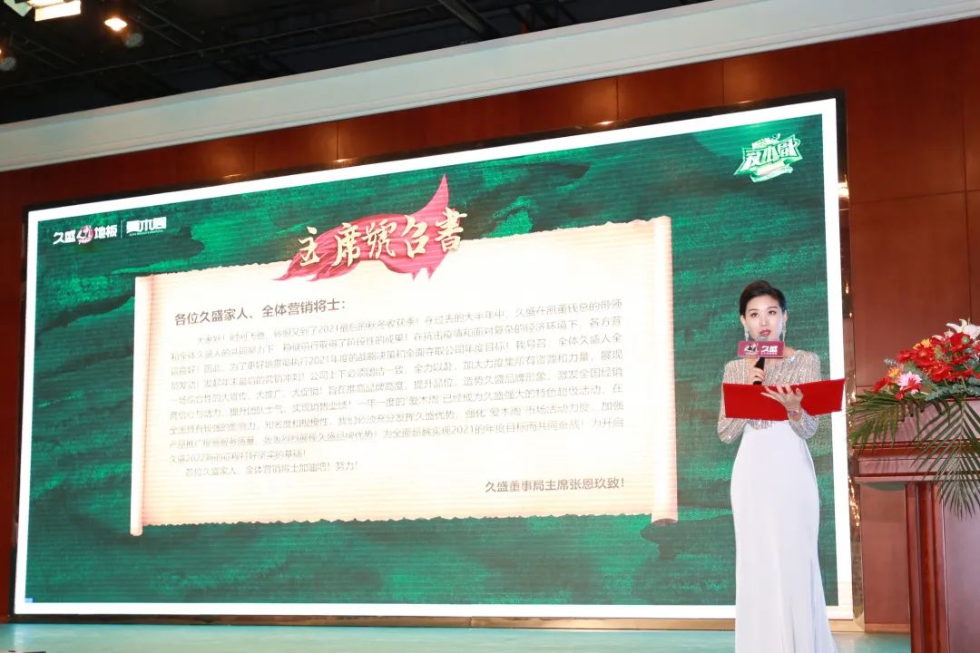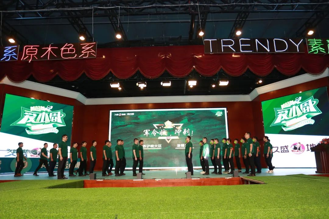 最后在久盛地板董事局主席張恩玖對全體久盛家人、全體營銷戰(zhàn)士的寄語鼓勵下,久盛地板浙贛大區(qū)總經(jīng)理陳斌、蘇滬皖大區(qū)總經(jīng)理沈俊來到舞臺上帶領(lǐng)兩大區(qū)的將士們接受最高指示,與臺下的各位一起立下愛木周軍令狀。兩位大區(qū)總也接過了來自指揮部錢總發(fā)出的最高指令。每個人的眼中都逐漸透露一股決心和信心,已經(jīng)為愛木周活動做好了奮戰(zhàn)準(zhǔn)備。