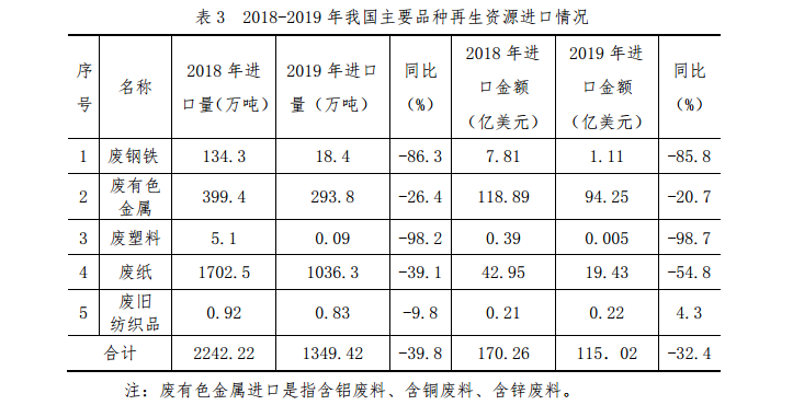 2019 年,在綠色發展理念引領下,國家對再生資源重視程度明顯提高,再生資源領域政策支持和制度保障力度加大,多項重大利好政策相繼出臺,持續為行業注入增長動力,推動再生資源行業向集聚化、集約化方向發展。1 月,國家發展改革委辦公廳、工業和信息化部辦公廳發布《關于推進大宗固體廢棄物綜合利用產業集聚發展的通知》(發改辦環資〔2019〕44 號),提出建設一批具有示范和引領作用的綜合利用產業基地,促進產業集聚,提高資源綜合利用水平。4 月,工業和信息化部辦公廳、國家開發銀行辦公廳聯合發布《關于加快推進工業節能與綠色發展的通知》(工信廳聯節〔2019〕16 號),明確提出支持實施大宗工業固廢綜合利用項目,推動廢鋼鐵、廢塑料、退役新能源汽車動力蓄電池等再生資源的綜合利用。5 月,《報廢機動車回收管理辦法》(國務院令第715號)取消了報廢汽車回收拆解企業總量控制要求,實行“先照后證”制度,允許“五大總成”再制造再利用和舊件流通,報廢機動車的收購價格改為由市場主體自主協商定價,通過規范報廢機動車回收拆解行為,暢通汽車產業循環發展鏈條,促進報廢機動車回收拆解行業的快速發展。2006年以來,國家標準委等14部門先后發布《2005-2007年資源節約與綜合利用標準發展規劃》、《2008-2010 年資源節約與綜合利用標準發展規劃》,其中廢舊產品及廢棄物回收與再利用重點項目 100 多項。在政府、行業協會以及企業等多方的共同努力下,再生資源行業標準化建設取得階段性進展,截至 2019 年底,我國再生資源回收利用領域現行的國家標準 164 項、在研的國家標準計劃 38 項、現行的行業標準 139 項、發布團體標準 70 項,已形成國標與行標相結合,強制性與推薦性相協調,覆蓋廢鋼鐵、廢有色金屬、廢塑料、廢紙、廢舊紡織品、廢棄電器電子產品等多個再生資源品種,涵蓋回收和利用領域的標準體系,基本滿足了產業發展對標準化工作的需求,有效促進了資源循環利用產業規模化、規范化發展,并將繼續推動產業調整升級、轉變經濟增長方式、提升國際競爭力。近年來,我國再生資源回收行業規模明顯擴大,全國廢鋼鐵、廢有色金屬、廢紙、廢塑料、廢輪胎、廢棄電器電子 產品、廢玻璃等主要品種再生資源回收總量逐步攀升。從全國來看,大部分地區已建立起以回收網點、分揀中心和集散市場(回收利用基地)為核心的三位一體回收網絡。據不完全統計,河北、山西、遼寧、黑龍江、江蘇、安徽、江西、山東、河南、湖北、湖南、廣東、海南、甘肅、青海、寧夏、新疆、重慶、廈門、寧波、大連、青島等 22 個省、市、自治區和計劃單列市,目前已形成回收網點約 15.96 萬個,分揀中心 1837 個,集散市場 266 個,分揀集聚區 63 個,回收網絡已初具雛形。一批龍頭企業迅速發展壯大,創新能力、品牌影響力和示范帶動作用不斷凸顯,垃圾分類與再生資源回收銜接模式、“互聯網+回收”模式、手機 app 或熱線平臺服務模式逐步成熟,集回收、分揀、集散為一體的再生資源回收體系逐漸完善。在政府引導和市場化機制運行下,上海、廣東等省市生活垃圾分類工作穩步開展。結合垃圾分類工作的開展,多個省市鼓勵有條件的地區、企業或公共場所開展再生資源回收系統與生活垃圾收運系統“兩網銜接”,鼓勵和推動回收體系與垃圾收運體系各環節有機結合,通過環衛系統與再生資源回收企業的合作,推動垃圾分類回收體系和再生資源回收體系的融合,如浙江虎哥環境有限公司打造以生活垃圾分類服務為核心的社區生活服務平臺,通過精細分類,解決廢塑料、廢玻璃等低價值再生資源回收問題,大幅提高再生資源回收率;飛螞蟻、四川銀谷智聯和深圳恒鋒等企業紛紛進入社區,將廢舊衣物回收融入網絡,規范廢舊衣物回收、提高回收量的同時,垃圾減量也取得明顯成效,實現資源回收與生活垃圾分類協同發展。2016 年,商務部、國家發展和改革委員會等 6 部門聯合發布《關于推進再生資源回收行業轉型升級的意見》,明確鼓勵企業利用互聯網、大數據和云計算等現代信息技術和手段,實現信息流與物質流的統一,在政策引導下,行業組織和企業積極探索開發再生資源回收信息化平臺。中國物資再生協會聯合回收利用單位、監管部門為醫療機構建設輸液瓶(袋)回收溯源體系,監管部門可通過管理數據平臺查看管轄地內的醫療機構輸液瓶(袋)產生、交接轉運和回收利用情況,實現數字化遠程監管和分級管理。輸液瓶(袋)分類投放、暫存、轉運、再利用的全生命周期追溯體系可有效杜絕輸液瓶(袋)違規利用,避免資源流入小散亂企業,大大提升了行業規范化水平。由于再生資源回收行業經營人員自身素質不高、場地簡陋、安全環保設施差以及稅收上繳少、效益低等原因,各地政府對再生資源回收項目的態度“冷熱不均”,目前某些地區對再生資源回收行業存在偏見,限制再生資源回收處理企業發展,有些地方干脆一禁了之,不允許再生資源回收利用企業落戶。由于再生資源來源廣泛、回收路徑復雜,目前國內回收企業普遍規模較小,設備簡陋,技術落后,再生資源分揀仍由人工進行粗略分類,不同類型、不同系列原料難以有效分離,下游企業利用過程仍需要花費人力和資金進行預處理,造成回收環節成本高,再生資源回收利用率低。