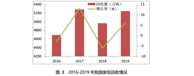 2019 年,我國廢紙回收量約 5244 萬噸,同比增長5.6%,廢紙回收率為 49.0%,廢紙利用率為 58.3%。在固體廢物進口政策影響下,進口廢紙量持續下滑,國內廢紙回收量呈上升趨勢。2016-2019 年我國廢紙回收情況如圖 8 所示。