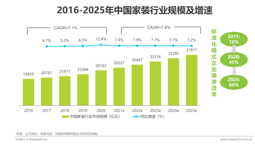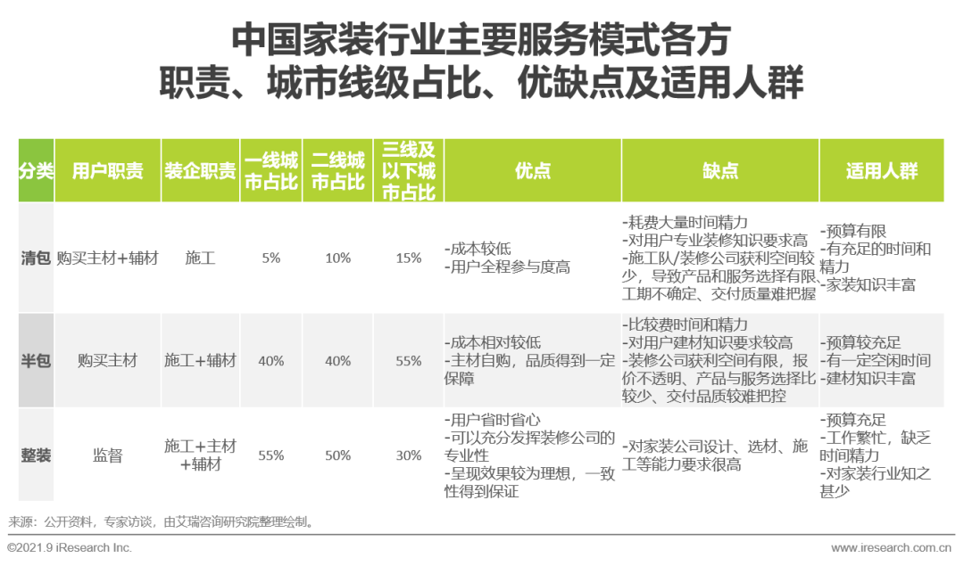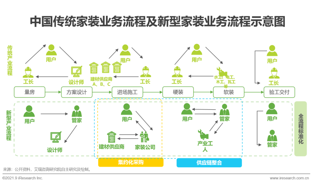 住宅裝飾和裝修行業(yè)屬于建筑裝飾業(yè)下的細(xì)分子行業(yè),主要作用在于美化居住環(huán)境和提高住宅功能性,在同一住宅生命周期內(nèi)可發(fā)生多次裝修行為,使得家裝行業(yè)具備可持續(xù)性的特點(diǎn),市場(chǎng)空間巨大。中國(guó)建筑裝飾協(xié)會(huì)統(tǒng)計(jì)數(shù)據(jù)顯示,2020年中國(guó)建筑裝修行業(yè)企業(yè)數(shù)量為10.6萬(wàn),呈逐年遞減態(tài)勢(shì),退出市場(chǎng)的企業(yè)以低資質(zhì)小公司為主;但與此同時(shí)家裝企業(yè)集中度極低,龍頭企業(yè)營(yíng)收均未過(guò)50億,市占率都低于1%。究其原因,家裝行業(yè)服務(wù)端從早期的施工隊(duì)、設(shè)計(jì)工作室,發(fā)展至裝修公司,期間產(chǎn)生了升級(jí)更迭但絕非完全替代。時(shí)至今日,傳統(tǒng)家裝企業(yè)數(shù)量多且較為分散,區(qū)域型特征明顯,缺乏統(tǒng)一的標(biāo)準(zhǔn)化施工流程,導(dǎo)致行業(yè)集中度較低。 產(chǎn)業(yè)工人:結(jié)合信息技術(shù),推動(dòng)工人產(chǎn)業(yè)化與職業(yè)化趨勢(shì) 家裝需求中存量房改造的需求比例逐步提升,并開(kāi)始成為行業(yè)增長(zhǎng)的新動(dòng)力,且新型消費(fèi)群體相對(duì)具有更強(qiáng)的個(gè)人消費(fèi)意識(shí),其家裝需求也更為精細(xì),因此通過(guò)數(shù)字化技術(shù)來(lái)提升用戶(hù)的家裝服務(wù)體驗(yàn),解決之前由于人工原因帶來(lái)的“量房不準(zhǔn)、設(shè)計(jì)時(shí)間長(zhǎng)”等問(wèn)題。目前行業(yè)頭部玩家如愛(ài)空間、東易日盛、綠色家裝飾等通過(guò)3D設(shè)計(jì)軟件和BIM建模軟件來(lái)深化自身的設(shè)計(jì)平臺(tái)能力,通過(guò)ERP等企業(yè)資源管理系統(tǒng)來(lái)提升內(nèi)部業(yè)務(wù)聯(lián)動(dòng)速度、提高業(yè)務(wù)鏈路效率,通過(guò)MES系統(tǒng)來(lái)實(shí)現(xiàn)設(shè)計(jì)、采購(gòu)、施工、驗(yàn)收全業(yè)務(wù)的管控。綠色家科技深耕AI+BIM+VR技術(shù),一整套家裝產(chǎn)業(yè)完整閉環(huán)的設(shè)計(jì)軟件系統(tǒng)賦能家居行業(yè)。三項(xiàng)核心技術(shù)賦能裝配式裝修:AI人工智能設(shè)計(jì),基于谷歌AI技術(shù),無(wú)需設(shè)計(jì)專(zhuān)業(yè)基礎(chǔ),零設(shè)計(jì)基礎(chǔ)人群即可使用,實(shí)現(xiàn)“自動(dòng)化設(shè)計(jì)”;VR場(chǎng)景表像,木紋級(jí),紋理級(jí)的表現(xiàn)漫游場(chǎng)景;BIM算量圖紙技術(shù)實(shí)現(xiàn)。家裝行業(yè)整體數(shù)字化程度正在快速提升。 數(shù)據(jù)顯示,家裝消費(fèi)者中年輕人群占比超過(guò)85%,通過(guò)需求側(cè)重點(diǎn)分析可以發(fā)現(xiàn),年輕消費(fèi)者對(duì)于設(shè)計(jì)風(fēng)格的多樣性和定制化需求更高,這說(shuō)明家已經(jīng)升級(jí)為生活方式的具象化體現(xiàn)。面對(duì)越發(fā)重視生活品質(zhì)的客群,傳統(tǒng)家裝公司逐個(gè)滿(mǎn)足消費(fèi)者的個(gè)性化需求的運(yùn)營(yíng)邏輯,導(dǎo)致其很難實(shí)現(xiàn)規(guī)?;瘮U(kuò)張。個(gè)性化趨勢(shì)下,頭部家裝企業(yè)通過(guò)標(biāo)準(zhǔn)化的產(chǎn)品運(yùn)營(yíng)思維,將消費(fèi)者個(gè)性化需求進(jìn)行調(diào)研、匯總、分類(lèi),集合成具有共性的家裝設(shè)計(jì)模塊,配合推、拉式供應(yīng)鏈模式,為消費(fèi)者提供滿(mǎn)足理想生活方式的家裝解決方案。 當(dāng)前,規(guī)模化裝企普遍采用直采模式來(lái)避免代理商和經(jīng)銷(xiāo)商的渠道加價(jià),供應(yīng)鏈環(huán)節(jié)的簡(jiǎn)化使得下游用戶(hù)端可減少30-45%的成本。隨著人工成本和材料價(jià)格的透明度提升,主營(yíng)硬裝的家裝企業(yè)利潤(rùn)率已經(jīng)非常固定,整裝大家居趨勢(shì)下,企業(yè)只有在產(chǎn)業(yè)鏈路上延伸布局,通過(guò)對(duì)業(yè)務(wù)深度的不斷挖掘才可獲得利潤(rùn)的提升。 上世紀(jì)90年代末我國(guó)房改制度全面推行,房地產(chǎn)行業(yè)蓬勃發(fā)展,2010年至2020年,我國(guó)商品房銷(xiāo)售面積除2014年相較2013年出現(xiàn)輕微下降,其余年份均同比增長(zhǎng),十年間積累了大量住房庫(kù)存,同時(shí)近三年來(lái)我國(guó)年均新開(kāi)工面積維持在16億平方米上下。持續(xù)韌性的地產(chǎn)建設(shè)和地產(chǎn)銷(xiāo)售對(duì)房地產(chǎn)投資起到一定的帶動(dòng)作用,為家裝行業(yè)奠定了夯實(shí)的產(chǎn)值基礎(chǔ)。 隨著疫情催生出大量家裝需求,廣闊的家裝市場(chǎng)吸引了阿里、京東等互聯(lián)網(wǎng)巨頭紛紛入局,憑借其高效的引流獲客能力、資源整合能力以及成熟的平臺(tái)運(yùn)營(yíng)能力,實(shí)現(xiàn)“硬裝+軟裝”、“產(chǎn)品+服務(wù)”全方位的家裝家居一站式解決方案,對(duì)家裝行業(yè)帶來(lái)了全新沖擊,但是通過(guò)對(duì)比不難發(fā)現(xiàn)在供應(yīng)鏈整合/一體化、裝修專(zhuān)業(yè)化程度、用戶(hù)忠誠(chéng)度等維度家裝企業(yè)的優(yōu)勢(shì)更加明顯。 基于調(diào)研數(shù)據(jù),新家裝修的家裝動(dòng)機(jī)仍然居于家裝消費(fèi)需求產(chǎn)生的主要原因,其占比達(dá)到34.2%。但舊房改造(14.6%)、審美變化(10.2%)、擴(kuò)大家庭收納(5.4%)等存量房相關(guān)的比例已經(jīng)超過(guò)30%,存量房的家裝動(dòng)機(jī)