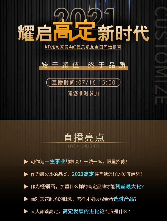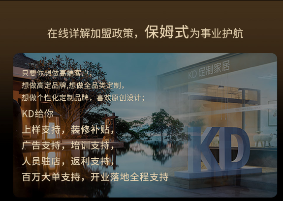 此次KD定制家居聯合紅星美凱龍全國嚴選招商,推出了力度巨大的優惠加盟政策,旨在攜手經銷商一起搶占市場風口,開創財富未來。