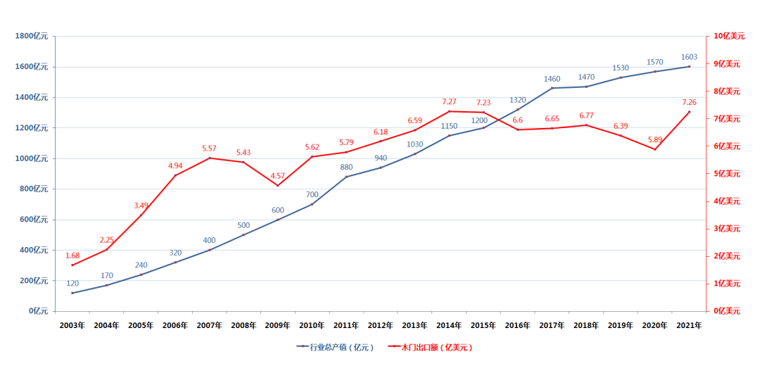 中國木門行業(yè)歷年產值、出口額統(tǒng)計圖