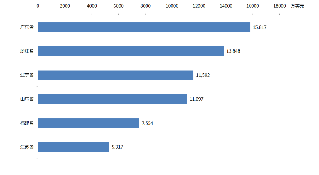 出口額排名前六位達到5000萬美元以上的省份依然是:廣東省、浙江省、遼寧省、山東省、福建省、江蘇省。與去年同期相比,廣東省增長21.2%,浙江省增長16.54%,遼寧省增長5.81%,山東省增長26.89%,福建省增長22.5%,江蘇省增長42.11%。