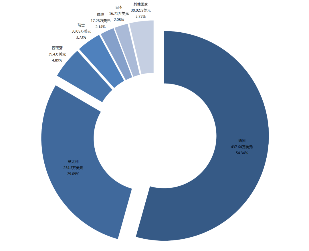 海外木門產品采購來源國主要為德國和意大利,上述兩國進口額之和占進口總額的83.43%。