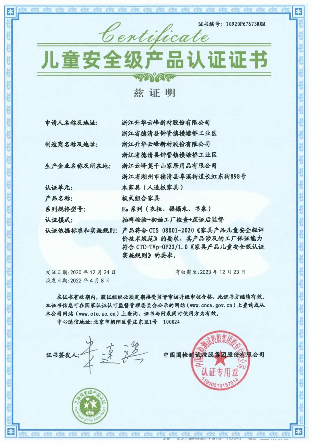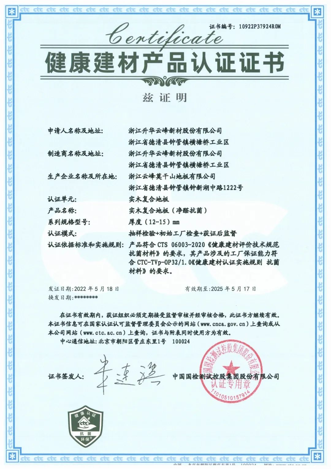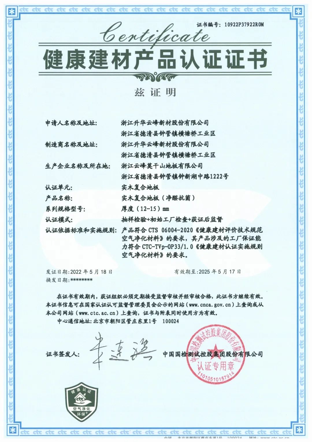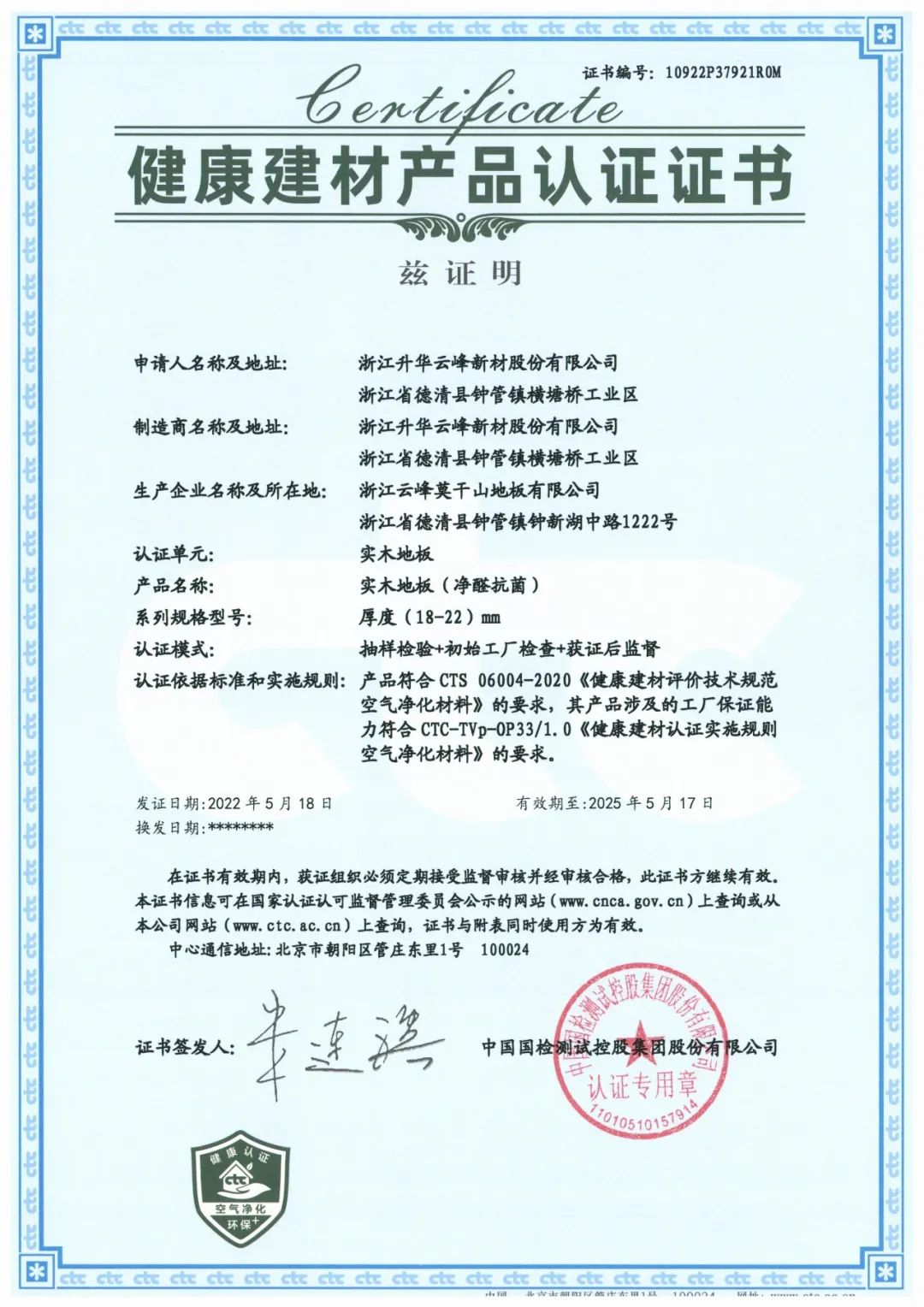 2022年,莫干山板式組合家具再次榮膺“兒童級產品認證證書”和“CTC產品自愿認證年度監督合格通知書”雙重認證。同時,浸漬紙層壓木質地板、實木復合地板、實木地板也相繼獲得了“兒童級產品認證證書”,其中實木復合地板和實木地板更是以其在抗菌、空氣凈化功能上的優勢強勢突圍,將“健康建材產品認證證書”收入囊中。這既是對莫干山大家居品質的高度認可,也證明了莫干山的綠色環保實力再上新臺階。
