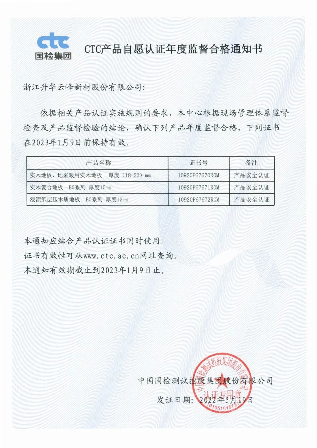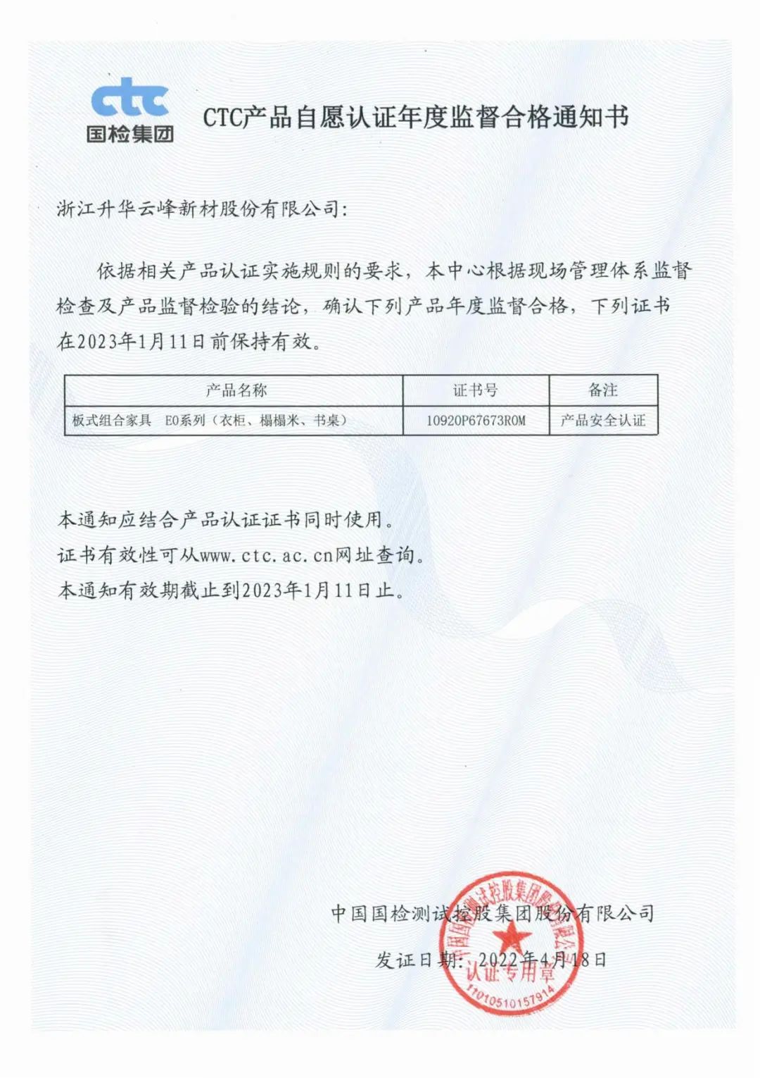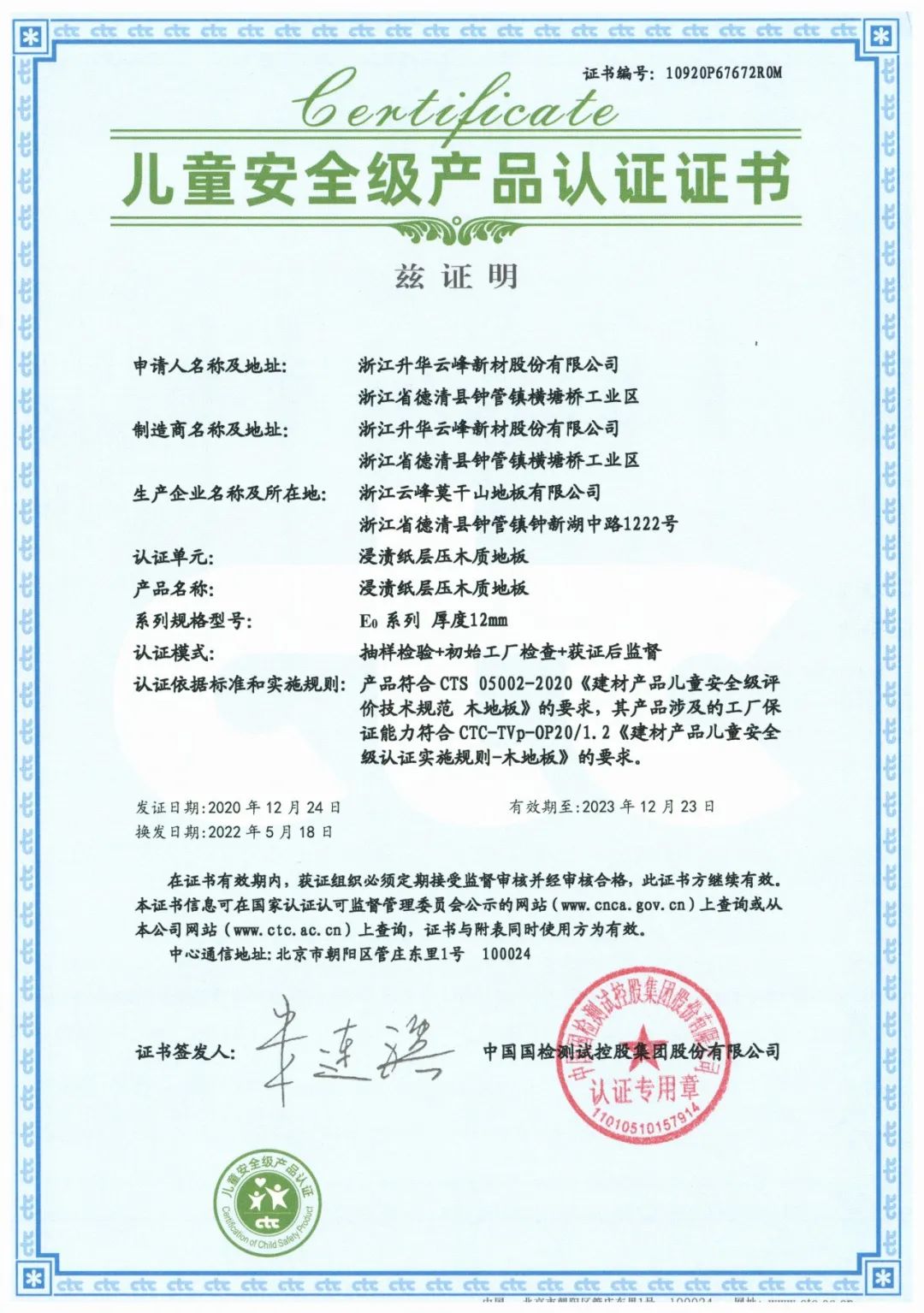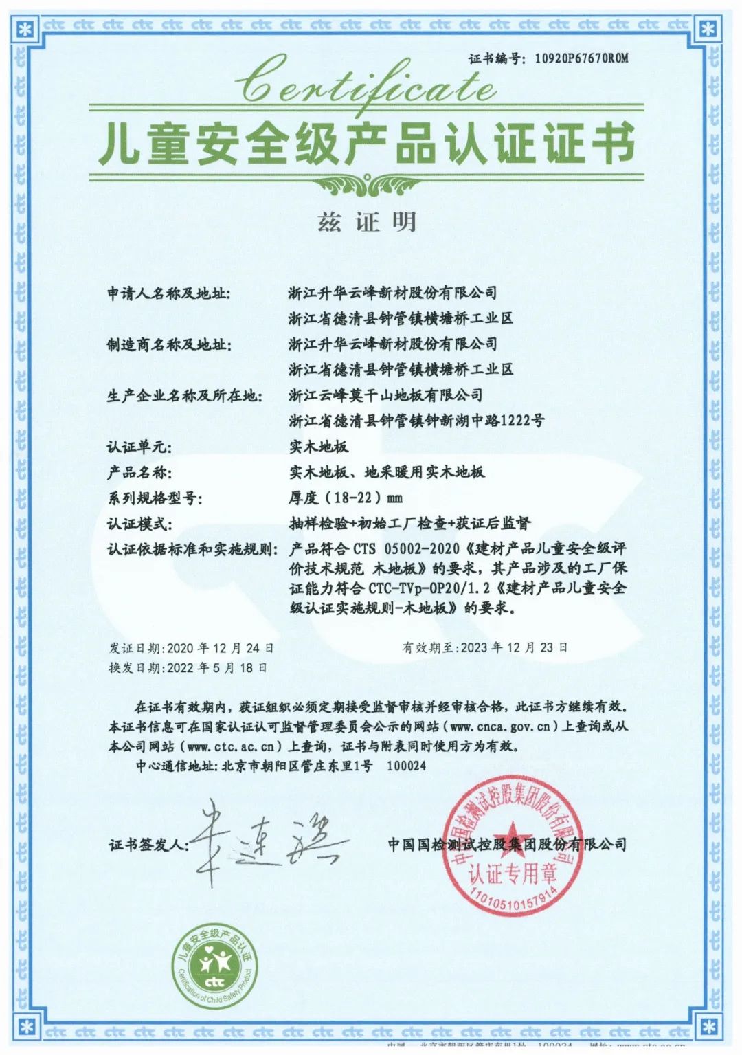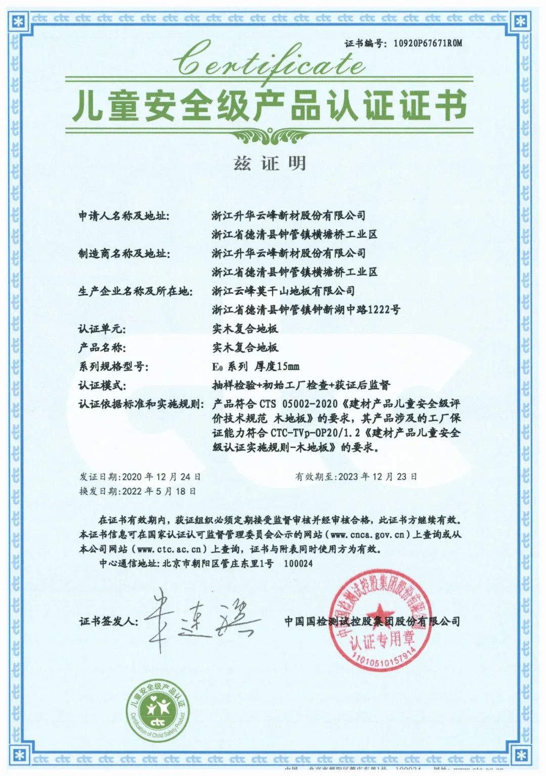 2022年,莫干山板式組合家具再次榮膺“兒童級產品認證證書”和“CTC產品自愿認證年度監督合格通知書”雙重認證。同時,浸漬紙層壓木質地板、實木復合地板、實木地板也相繼獲得了“兒童級產品認證證書”,其中實木復合地板和實木地板更是以其在抗菌、空氣凈化功能上的優勢強勢突圍,將“健康建材產品認證證書”收入囊中。這既是對莫干山大家居品質的高度認可,也證明了莫干山的綠色環保實力再上新臺階。