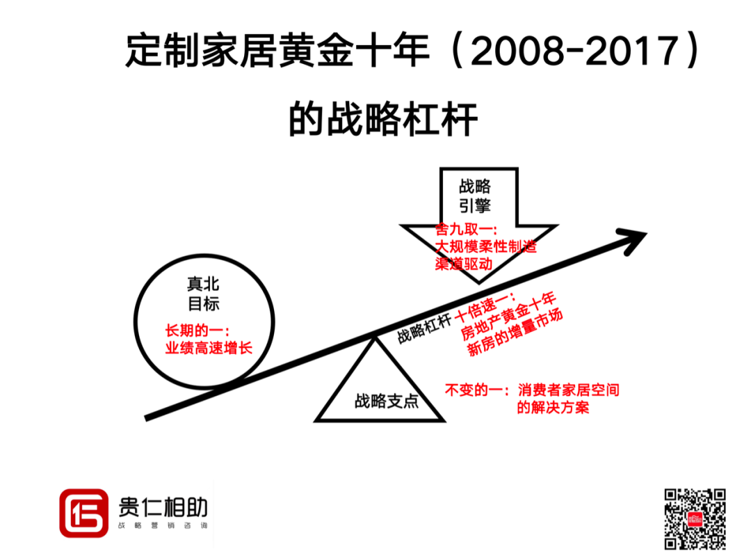 中國定制家居的黃金十年(2008年-2017年),戰略支點,也就是“不變的一”——就是提供給消費者家居空間的解決方案——這個催生了中國定制家居從衣柜到全屋定制,從全屋定制到大家居,從大家居到今天整家定制的演化路徑;“長期的一”就是企業高速增長;“十倍速的一”就是房地產的黃金十年,以新房為主的增量市場紅利;“舍九取一”的戰略引擎就是中國定制家居的大規模柔性化制造+終端經銷商渠道的雙輪驅動。見下圖。