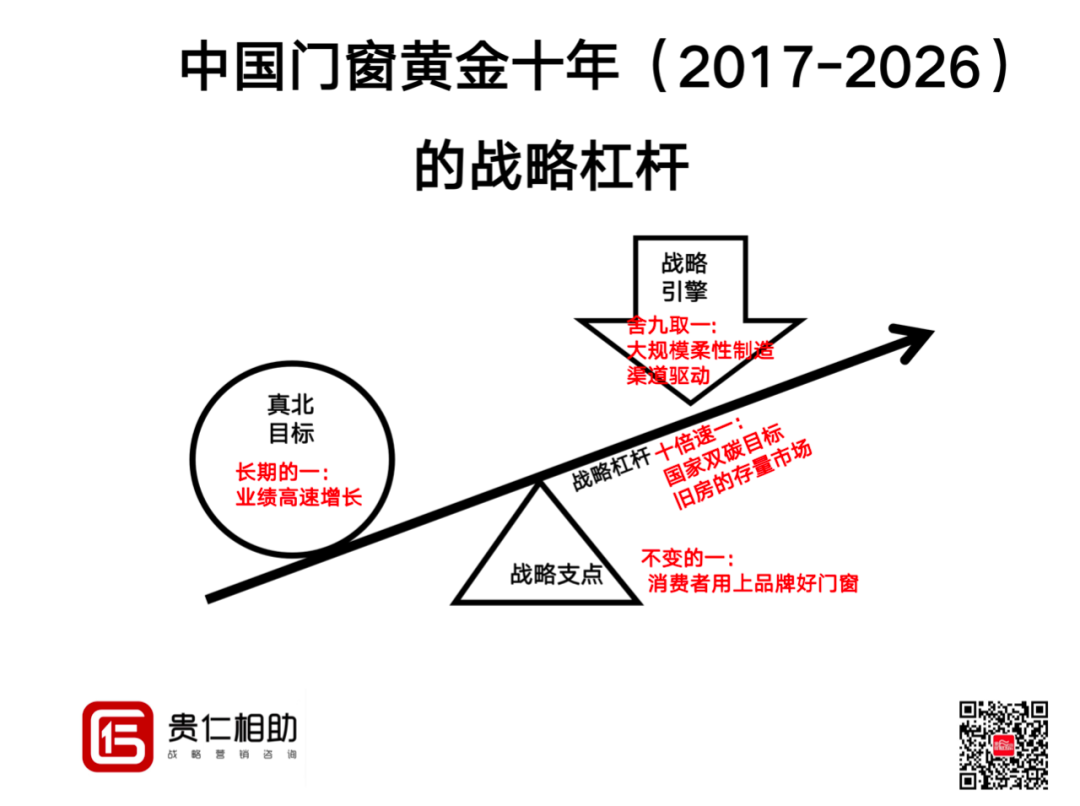 中國門窗行業的黃金十年(2017年—2026年),算上今年至少不少于五年的高速發展期,“不變的一”戰略支點就是消費者需要品牌化的好門窗;“長期的一”就是門窗企業的高速發展;“十倍速的一”就是國家雙碳目標的時代大紅利疊加中國房地產進入拐點之后的大量存量房的舊窗換新紅利;“舍九取一”的戰略引擎,我認為,與中國定制家居是一樣的,門窗的大規模柔性定制,雖然現在對比定制家居行業,門窗行業還有很多落伍的地方,但隨著資本的介入,行業的高速進化,只是時間早晚的問題。大規模柔性制造+渠道拓展的雙輪驅動,必然,讓中國門窗行業步入快車道!見下圖。