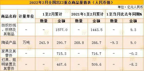 3月7日,中國(guó)海關(guān)總署發(fā)布前2022年1-2月進(jìn)出口情況。據(jù)海關(guān)統(tǒng)計(jì),2022年前2個(gè)月: 家具及其零件出口額為715.3億元,同比下降0.2%; 陶瓷產(chǎn)品出口額為290.7億元,同比增長(zhǎng)9%; 燈具、照明裝置及其零件出口額為467.6億元,同比下降8.2%; 紡織紗線、織物及其制品出口額為1577億元,同比增長(zhǎng)9.3%。 此外,運(yùn)力的影響和運(yùn)費(fèi)的高漲,大宗商品、原材料的上漲,還有人民幣匯率升值的壓力,勞動(dòng)力成本的提高,都是外貿(mào)企業(yè)碰到的“困難”,特別是中小企業(yè)更加困難。 就總體形勢(shì)來(lái)看,今年前2個(gè)月,中國(guó)進(jìn)出口總值6.2萬(wàn)億元,比去年同期增長(zhǎng)13.3%。其中,出口3.47萬(wàn)億元,增長(zhǎng)13.6%;進(jìn)口2.73萬(wàn)億元,增長(zhǎng)12.9%;貿(mào)易順差7388億元,增加16.3%。 另外,值得關(guān)注的是,今年前2個(gè)月,歐盟重新超過(guò)東盟成為中國(guó)第一大貿(mào)易伙伴。與此同時(shí),中國(guó)與RCEP貿(mào)易伙伴合計(jì)進(jìn)出口1.85萬(wàn)億元,同比增長(zhǎng)9.5%。隨著RCEP制度紅利的逐步釋放,RCEP成員經(jīng)貿(mào)發(fā)展成效將進(jìn)一步顯現(xiàn)。 展望未來(lái),分析師表示,考慮海外供應(yīng)鏈瓶頸或?qū)⒏纳疲袊?guó)的供給替代效應(yīng)將減弱,出口增速大概率趨緩。此外,受到烏克蘭局勢(shì)等因素影響,后續(xù)我國(guó)出口預(yù)計(jì)將面臨一定的不確定性。 編輯202202