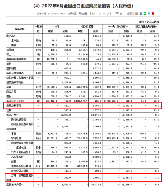 近日,國家海關總署發布《2022年6月全國出口重點商品量值表》,數據顯示,家具及其零件6月出口額為410.1億元人民幣,1-6月累計出口額2,264.7億元人民幣,同比增長0.2%;燈具、照明裝置及其零件6月出口額為280億元人民幣,1-6月累計出口額1,401.3億元人民幣,同比增長1%。