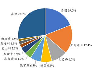 圖2 2021年我國刨花板進口來源占比(以進口量計算)