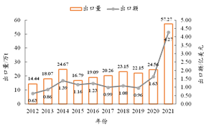 圖4 2012—2021年我國刨花板類產品出口量和出口額
