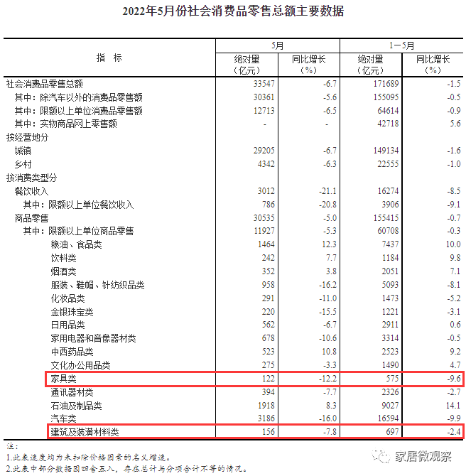 其中,家具類5月份社會消費品零售總額絕對值122億元,同比下滑12.2%;建筑及裝潢材料零售總額絕對值156億元,同比下滑7.8%。1-5月份整體家具類銷售總額575億元,同比下滑9.6%;建筑及裝潢材料1-5月份總銷售額697億元,同比下滑2.4%。
