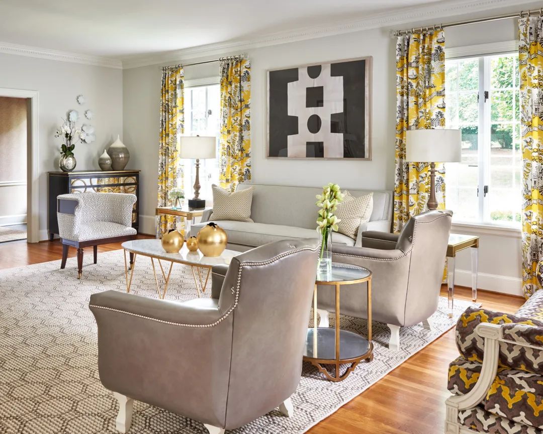 銀白色背景與巖石灰皮質沙發的雙灰疊加,令空間調性更加典雅內斂,低調沉穩。百合白的編織地毯讓空間更顯柔和。中國風圖案的小蒼蘭黃窗簾將明媚溫馨帶入空間,更顯誘人。大量藝術裝飾品和植物的裝點則讓空間愈發優雅動人。黑色與金色的應用少而精,更顯奢華有品位。