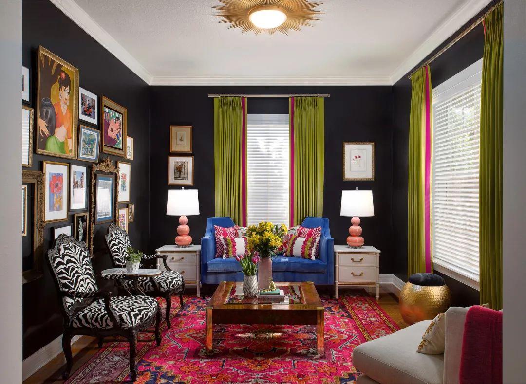 這是一間典型的Art Deco風格的客廳,啞光魅影黑油漆覆蓋了墻面營造出深邃感,色彩鮮明的家具與黑色背景形成鮮明的對比。