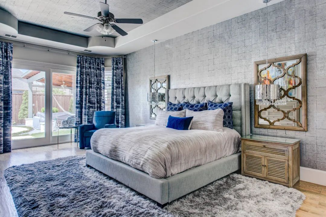 混色毛絨地毯帶來溫暖舒適的觸感,同銀色床品相契合。床頭兩側飾有花紋的金屬水晶燈帶來輕奢格調。米克諾斯藍的靠枕從材質和圖案兩方面形成對比,讓層次更豐富。床及床品與窗簾在色彩上遙相呼應,讓房間更有整體感。