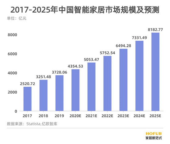 智能家居作為最具潛力消費(fèi)科技市場,近年來保持強(qiáng)勁增長態(tài)勢。億歐智庫根據(jù)Statista數(shù)據(jù)井加以整理測算得出2020年市場規(guī)模約為4354億元,預(yù)計(jì)2025年突破8000億元。從2019年中國各細(xì)分市場規(guī)模看,家電原始市場規(guī)模大、智能化發(fā)展早且滲透率高,所以在智能家居市場中規(guī)模最大,達(dá)2822億元。